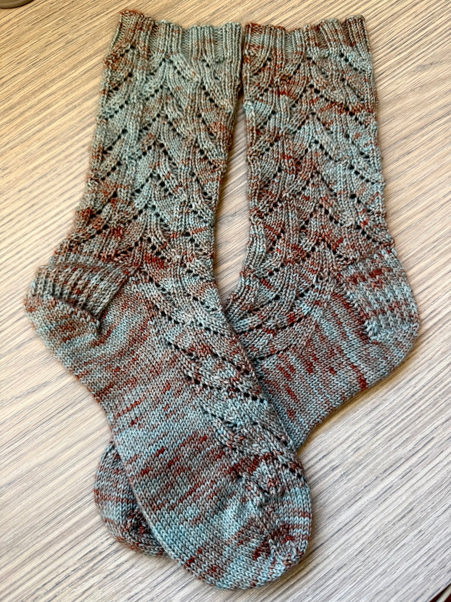 These top-down, lace socks feature an asymmetrical, geometric pattern with an art deco look. The pattern is easy to memorize and looks great in a wide range of yarn colors. The pattern includes instructions for two sizes (64-st and 72-st sizes) and both written and charted instructions.