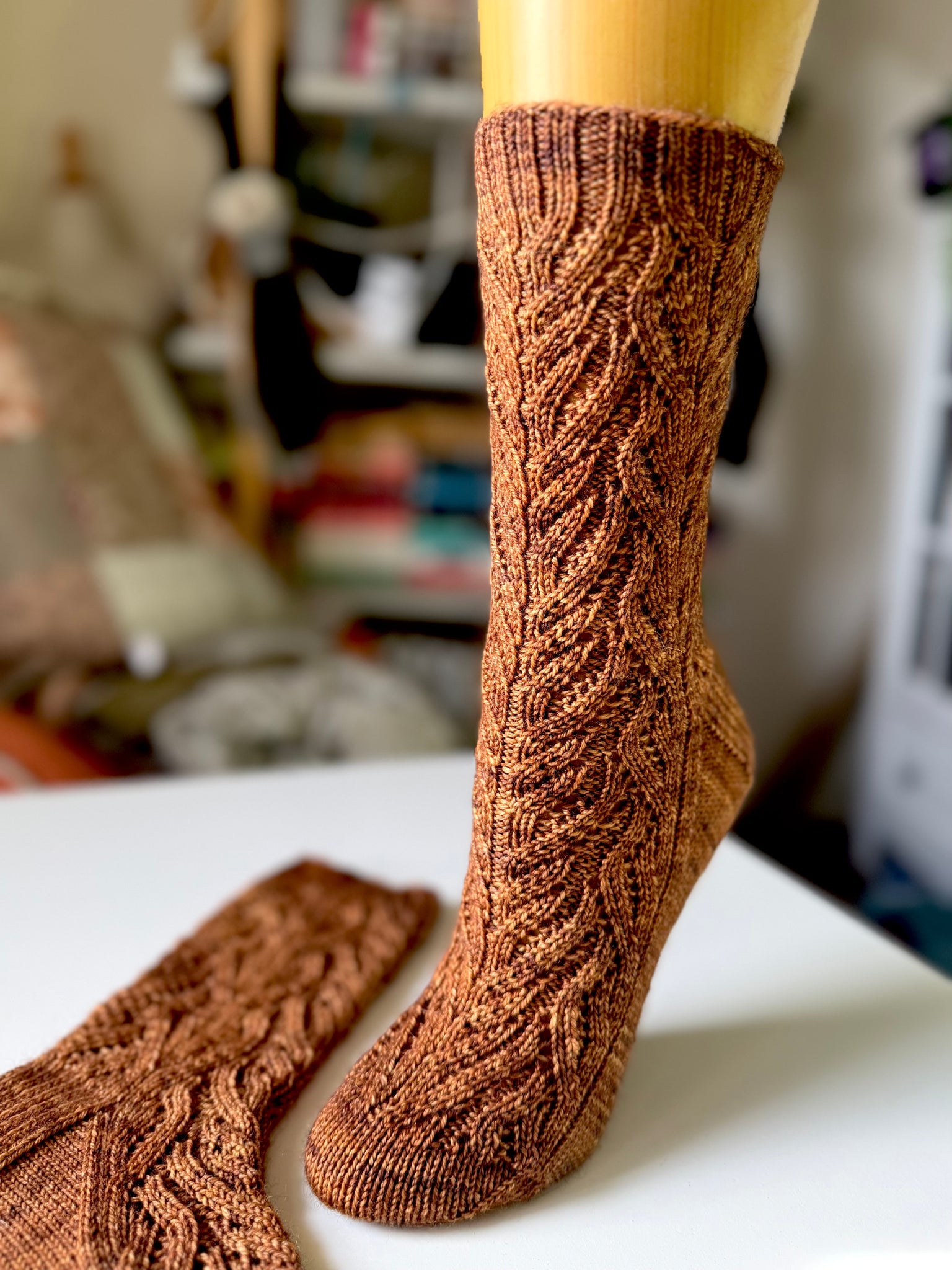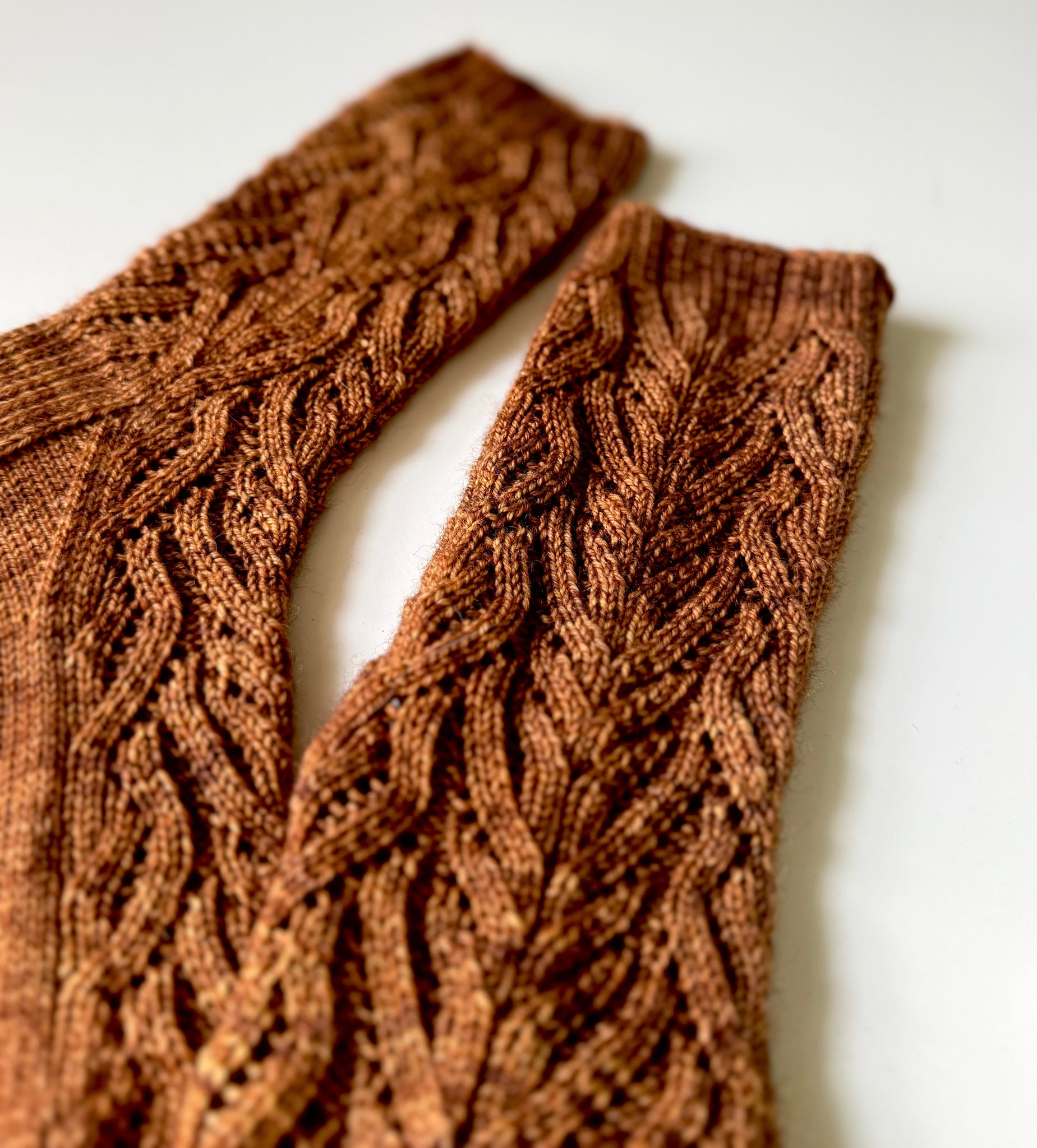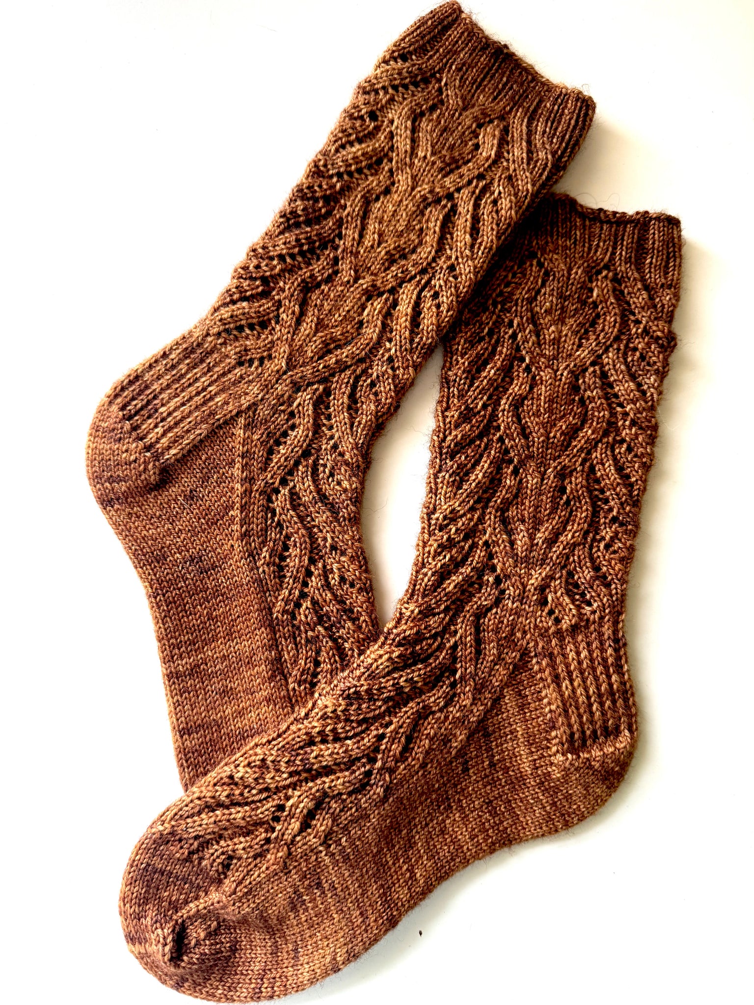 This top-down, lace sock design creates a flowing, faux cable look. I enjoyed every stitch of these. Written up for two sizes and in both written and charted instructions.